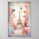 Poster with a stylised Eiffel tower image surrounded by pretty butterflies and delicate garden flowers.