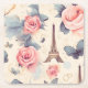 A paper coaster (sturdy pulp board) with an elegant pattern. Pink roses, blue-grey butterflies and an Eiffel tower. A French themed pattern.