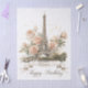 An elegant and romantic greeting card design featuring a beautiful watercolor-style illustration of the Eiffel Tower. The iconic Parisian landmark is surrounded by soft, pastel pink and cream roses and accented with delicate golden speckles. Customise with your own text the ribbon banner at the bottom display.