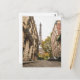 This postcard features a photo of the Eiffel Tower in Paris, France, as seen from the street.