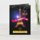 "Paris" themed, Eiffel Tower, "City of Lights" gold tone, multi-colour and hot pink folded photo Quinceañera celebration design, featuring the Eiffel tower in multi-colours to appear as if it is lit up with lights on it, above it and behind it. A hot pink banner announcing a "Quinceañera" (15th birthday party) sits overlapping the tower on front with your occasion's details on the back inside with a repeat of the Eiffel Tower on top. Your daughter's photo can go on the left inside or photo template can be deleted, leaving the lit background.