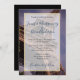 A wedding invitation with a photograph of the Eiffel Tower taken at an angle giving it an interesting perspective. Accentuating the metal lattice work. A semi-transparent frame with a gold coloured border layered over top.