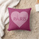 Eiffel Tower Paris pillow for Paris Lovers everywhere. Reads Paris in bright magenta pink letters with a darker pink Eiffel Tower forming the A. Against a heart shaped textured look background with faded pink distressed Parisian French sheet music. Dark pink purple background which is the same shade as the Parisian text letters. Has coordinating soft pink background on back, which is a custom shade from the design. Both background colours on each side of the pillow may be changed to a favourite colour or to match your decor. Perfect present for a world traveller, decor for a teen girl bedroom, or anyone who wants to proclaim I Love Paris.