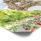 This watercolor artwork beautifully captures the iconic Eiffel Tower, towering above a bustling Parisian street scene. The soft, fluid brushstrokes evoke a light and airy atmosphere, with vibrant green trees and colourful market stalls lining the foreground. The detailed structure of the tower contrasts with the playful, impressionistic depiction of the crowd, creating a charming balance between architectural precision and artistic whimsy. The blue sky and scattered clouds add a serene backdrop, enhancing the romantic charm of the scene.