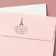 Tres chic! Add a touch of Parisian flair to your correspondence with our Eiffel Tower return address stamp, featuring an Eiffel tower silhouette topping your return address details in classic block and italic lettering.