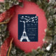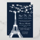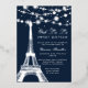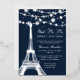 A modern, chic and glamourous sweet sixteen with a hand drawn silver glitter french Paris theme Eiffel Tower with silver glitter sparkles confetti, white string lights on an editable dark navy blue background with real silver foil.