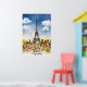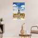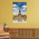 A watercolor painting of the Eiffel Tower in Paris, France, surrounded by colourful flowers, under a blue sky with fluffy clouds.