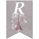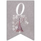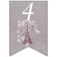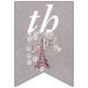 This flag shaped bunting Happy Birthday banner is light grey with a illustration of the Eiffel tower in France surrounded by white daisy flowers with the text Oh, Paris. Customise the birthday year with the templates.