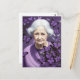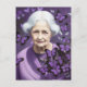 An elderly woman wears a purple outfit and is surrounded by beautiful imaginary purple butterflies instead of their normal orange and black colour.