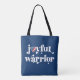 “Joyful Warrior”. Stand proud and share your support for Kamala Harris with this playful, fun, graphic, patriotic tote bag. Whimsical bold, white calligraphy typography and a rustic wood American flag heart overlay a navy blue background. Embrace your warrior self, proudly celebrate being a feminist and help shape the future of this wonderful country. Vote blue!