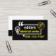 Overleaf, in a white cover, at the top is your prestigious name and contact details. The slogan caption option is located at the base inside a black layer. A great card for electricians to use.