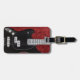 Black, electric guitar luggage tag with text template on one side. Dark red graphic design on both sides. The partial image of a black guitar is on the front with bold white text on the back. Identify your luggage easily with a unique tag.