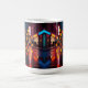 White ceramic mug with blazing neon orange and cool blue city bokeh, rain-slick reflections, full-wrap glossy urban night artwork.