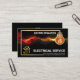 A faux copper electrical circuit frame is powered by a red electrical lightning that lights up a bulb with repair tools inside. Just beside the bulb stands your prestigious name. Near the base of the card are your business name and contact details with a gold "letter-e" electrician logo you can use.