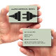 Newly created Electrician business card template in a bold and simple two side design with graphic image of an electrical cord and plug with your business name featured on the front and your contact information laid out on the flip side. Created for an electric contractor or independant electrician service.