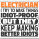 Funny Electrician Sayings "Electrician I Try To Make Things Idiot Proof But They Keep Making Better Idiots". Grab this Funny Electrician design as a funny gifts for an awesome mum, dad or friend.