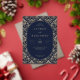 This is a classic style image featuring an elegant wedding invitation with intricate gold floral patterns on a navy blue background. The design exudes sophistication and timeless charm, making it perfect for a formal celebration. The text is centered within an oval frame, highlighting the names "Lauren and Benjamin" along with the details of their special day. It's ideal for couples who want to convey a sense of luxury and grace at their wedding event.