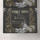 Elegance in silver and black. This image features a black and white illustration of a wedding frame with intricate gold and silver embellishments. The frame is adorned with ornate floral patterns and a central archway. A bride in a flowing gown, holding a bouquet, stands within the frame, facing away from the viewer. The background is a textured black surface, creating a dramatic and elegant atmosphere.