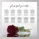 This beautiful wedding seating chart has table assignments for 100 guests at 10 tables (10 people per table.) The design is stylish, classy, romantic and chic, featuring a single burgundy, maroon, or wine-red colored rose reflecting in water with waves and ripples. There is a lacy script calligraphy title reading "please find your table" as well as space for the names of the couple and the wedding date. Great way to make your reception beautiful while helping your guests find the right seat.