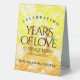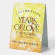 Add an extra special touch to 13th citrinewedding anniversary celebrations with this stylish table tent sign! Elegant lettering with hexagonal confetti on a yellow-orange mosaic background add a memorable touch for this special occasion and milestone. Customise with couple's names, dates of marriage, and congratulatory messages.