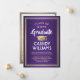 Share the joy of a high school or college graduation with these custom photo purple, gold and white announcements. (IMAGE PLACEMENT TIP: An easy way to centre a picture exactly how you want is to crop it before uploading to the Zazzle website.) This template includes graduate's name, class year & school, as well as any wording of your choice, such as party invitation details, special honours, degree title, favourite inspirational quote, graduate's contact info, future education plans, or new job position. All text is simple to personalise. Design features a modern purple ombre background, faux gold foil border & mortar board cap, elegant script calligraphy, traditional typography, and one photo of your choice, such as a senior picture or image from the commencement ceremony. Please note that gold is printed colour, not metallic foil. These graduation announcement cards are a trendy and chic way to share your special day celebration with family and friends. Congratulations to the graduate!