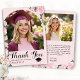 Create elegant graduation thank you cards for your family and friends with two custom photos (the arch-style photo on the front side and the rectangular one on the back) decorated with pink flowers and a grad's cap illustration. The template makes it easy to type the graduate's name, year and the thank you message.