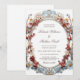 Celebrate your special day with this exquisite wedding invitation featuring a sophisticated Victorian-style oval frame. The design showcases intricate blue and gold scrollwork intertwined with a lush arrangement of delicate 3D-effect flowers in shades of dusty rose, soft peach, and muted blue. Perfectly suited for vintage-inspired, garden, or formal estate weddings, this invitation combines classic elegance with a touch of botanical artistry. All text elements can be easily customized to fit your specific ceremony details. Bride and room names only in an elegant calligraphic classic script.