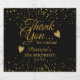 50th birthday thank you stickers with classy gold typography on black background with gold confetti sprinkled on top and bottom of label.