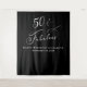 Elegant personalised 50th birthday party tapestry black photo booth backdrop with "50 & Fabulous" written in a stylish white script. Customise with her name and birthday date