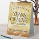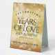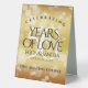 Add an extra special touch to 50th golden wedding anniversary celebrations with this stylish table tent sign! Elegant lettering with hexagonal confetti on a gold foil background add a memorable touch for this special occasion and extraordinary milestone. Customise with couple's names, dates of marriage, and congratulatory messages.