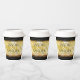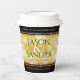 Celebrate the 50th golden wedding anniversary with these stylish paper cups! Elegant black and white serif lettering with hexagonal confetti on a gold foil background add a memorable touch for this special occasion and extraordinary milestone. Customise with couple's names, years of marriage, and congratulatory messages. Reverse shows identical design.