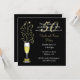 Chic fiftieth wedding anniversary party invitation, done in black and gold. Graphics of a festive glass of champagne decorated with a gold tone bow, on the stem, and sparkles coming out of the top, decorates the left side of the black invitation. White and gold tone text are fully customisable to suit your event needs.