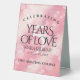 Add an extra special touch to 5th rose quartz wedding anniversary celebrations with this stylish table tent sign! Elegant lettering with hexagonal confetti on a rich pink background add a memorable touch for this special occasion and milestone. Customise with couple's names, dates of marriage, and congratulatory messages.