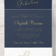 Elegant dark navy blue 60th birthday party all-in-one invitation featuring "60 & Fabulous" and your name in chic calligraphy scripts, your party details in simple modern lettering, and a white tear-away RSVP postcard, all rendered in your choice of genuine gold, silver or rose gold foil.