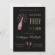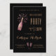 Celebrate her 80th birthday in style with this luxurious black and gold birthday party invitation. A watercolor of a pink champagne bottle popped open has a label that can be personalised with her birth year or initials, this year or other text up to 4 letters. Elegant typography is featured throughout, and her name is set off in a pretty script. Venue and party details are separated by a watercolor of two champagne glasses filled with bubbly pink champagne. You can personalised the birthday to another year if desired.