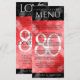 Add sophistication to 80th ruby wedding anniversary celebrations with this dinner menu, which features elegant lettering and hexagonal confetti on ruby red and black backgrounds. Customise with couple's names, dates of marriage, venue details, menu items, and congratulatory messages.