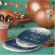 A fancy elegant abstract design with cream coloured lace and pearls made with circles and bubbles. The background is dark blue with faded squares off to the side. Pretty and delicate design. Happy birthday written in a fancy script font.