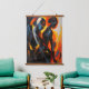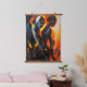 This stunning AI-generated abstract artwork wood topped wall tapestry art print showcases the beauty of the human form through an intricate blend of bold colours and abstract shapes. The central figure, a graceful silhouette of a woman, is bathed in fiery tones of red, orange, and yellow, contrasting sharply with deep blacks and soft greys. The swirling lines and vibrant colour palette create a sense of movement, emotion, and depth, making this piece an exceptional statement in any space.