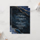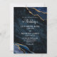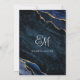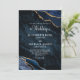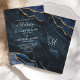 This elegant luxury wedding invitation features a chic trendy navy blue and gold agate gemstone background, coordinating white text, and an elegant script monogram on the back.