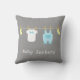 A cute pillow for decorating the baby boy's bedroom and nursery. It has mini baby clothes and accessories which includes items like yellow baby socks, a white baby jumpsuit with a bow tie and a pastel blue overalls with pocket hanging on a clothesline with wooden pegs. Great for celebrating the birth of baby boys. Pastel colours just stands out on the grey background and gives an elegance to it.