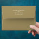 Custom A7 wedding invitation mailing envelopes feature formal style ivory return address text with scroll and antique gold (can be customised) printed background colour.