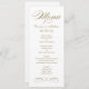 Elegant and formal wedding dinner menu cards feature a stylish script and scroll details with a vintage inspired design. White and antique gold colours. Personalise the custom monogram with the bride and groom names, event date, and menu details.