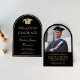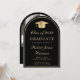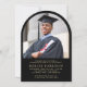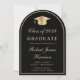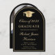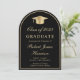 Classic black arch-shaped college graduation party invitation featuring a gold grad cap, the graduate's name and class year in an elegant gold script, and their school, major and honours. On the back, add a photo and personalise your party details.