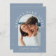 Modern chic dusty blue all-in-one wedding invitation featuring your photo in an arch frame and "Happily Ever After" in elegant white typography. Add your first names, wedding date and location. On the reverse side, personalise your invitation in simple white typography and input your wedding website address to create a scannable QR code for your guests to scan to RSVP online and obtain additional wedding details such as accommodations.