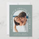 Modern sage green wedding invitation featuring your photo in an arched frame surrounded by "Celebrate Our Special Day With Us" in elegant white typography. Under your photo, add your first names, wedding date and location. On the reverse side, personalise your invitation in simple white typography and input your wedding website URL address to create a scannable QR code for your guests to scan to RSVP online and obtain additional wedding details such as accommodations and directions.