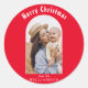 This classic round sticker features a red border with “Merry Christmas” text in white font at the top. Inside the border, there’s an arch-shaped photograph of two individuals embracing and smiling. Combining festive colours and a personalised photo, this sticker adds a warm and cheerful touch to holiday greetings and decorations.
