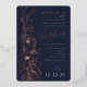 This wedding invitation showcases a rich navy blue background with flowing rose gold floral illustrations, creating a timeless and luxurious look. The elegant script font paired with classic serif text strikes a balance between modern romance and refined sophistication. Delicate metallic accents and a softly illustrated bee add a whimsical yet upscale touch, perfect for evening weddings or formal events with a romantic, botanical flair.