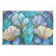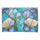 Colourful Art Nouveau pillow case printed with a stained-glass look alike botanical pattern with irises in tones of teal, blue and pale pastel purple.
