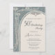 The invitation prominently features a decorative arch framing the celebratory message, immediately conveying a sense of grandeur. The design cleverly integrates Art Nouveau floral patterns, often illustrated in a stylised and flowing style, creating a visual representation of the artistic theme. The teal and silver colour palette adds a touch of vintage elegance. The invitation warmly welcomes guests to celebrate the birthday honoree. Event details are presented in a clear and easy-to-read format. RSVP information is also included.