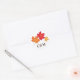 Fall themed wedding favor stickers feature maple leaves above customizable monogram of the bride and groom's initials. Rich autumn colors include orange, red, copper, gold, and chocolate brown. Ivory / ecru background.